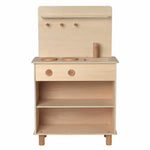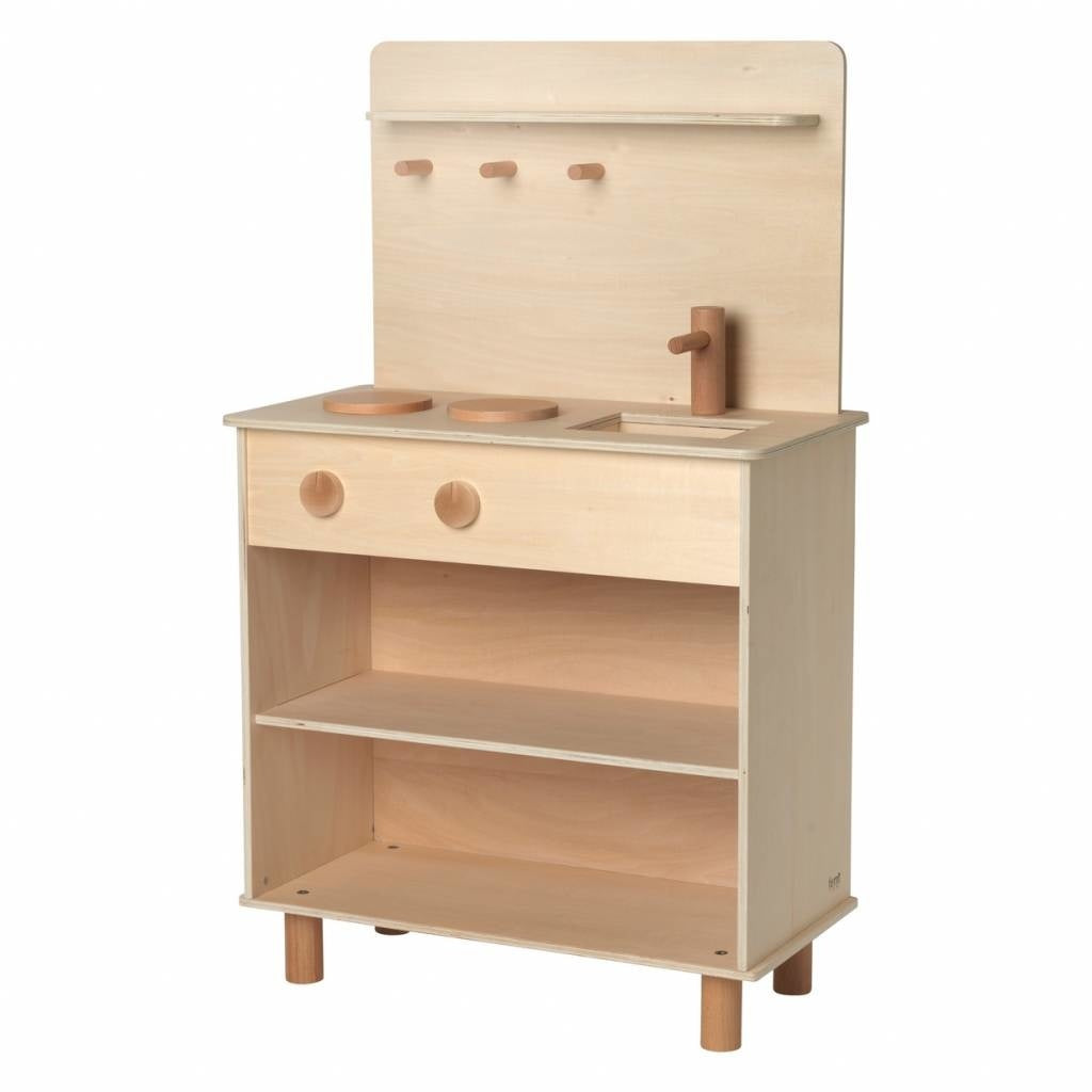 De keuken is gemaakt van natuurlijk multiplex, waardoor het een modern en stijlvol element in huis is. Zowel volwassenen als kinderen zullen het leuk vinden om ernaar te kijken. De keuken bestaat uit een gootsteen, een waterkraan, twee kookplaten, drie haken voor keukengerei en opbergplanken. De kleine details zijn gemaakt van natuurlijk, massief berkenhout.