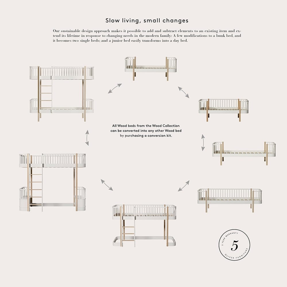 Alle bedden uit de Wood Collectie kunnen omgebouwd worden naar een ander bed uit de Wood Collectie. Zo is er altijd een bed wat bij de slaapwensen van jouw familie past, en dat zorgt voor jaren lang speel- en slaapplezier!