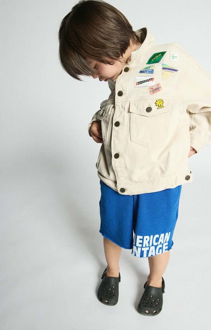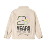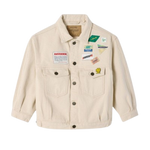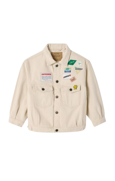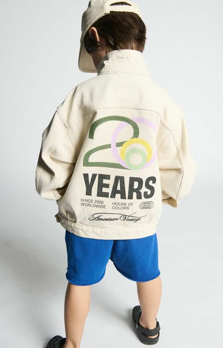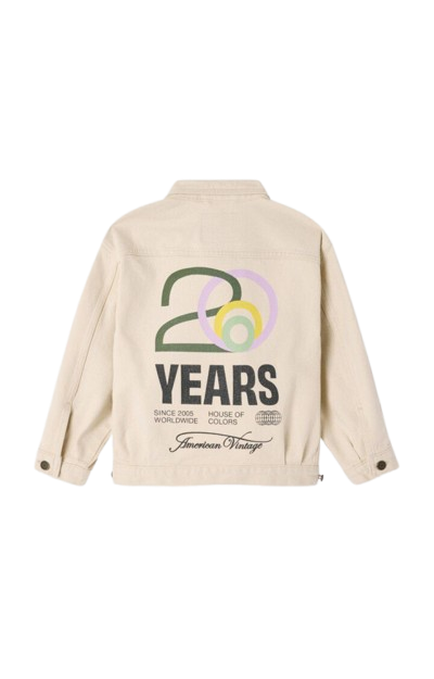 Zomers jeans jasje van American Vintage in een lichte ecru kleur. Het leuke jackje heeft voorop allerlei coole patches en achterop de tekst American Vintage 20 Years