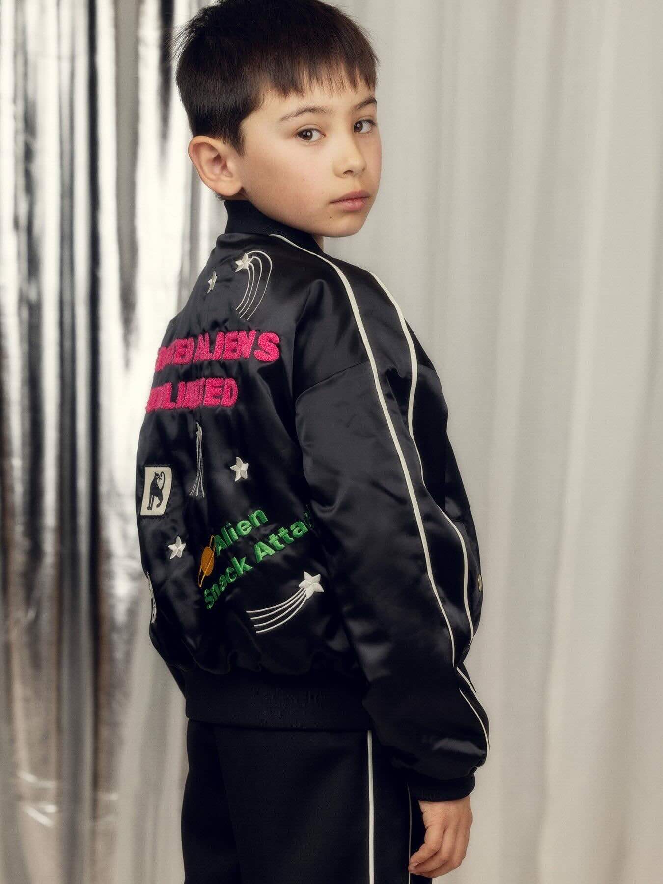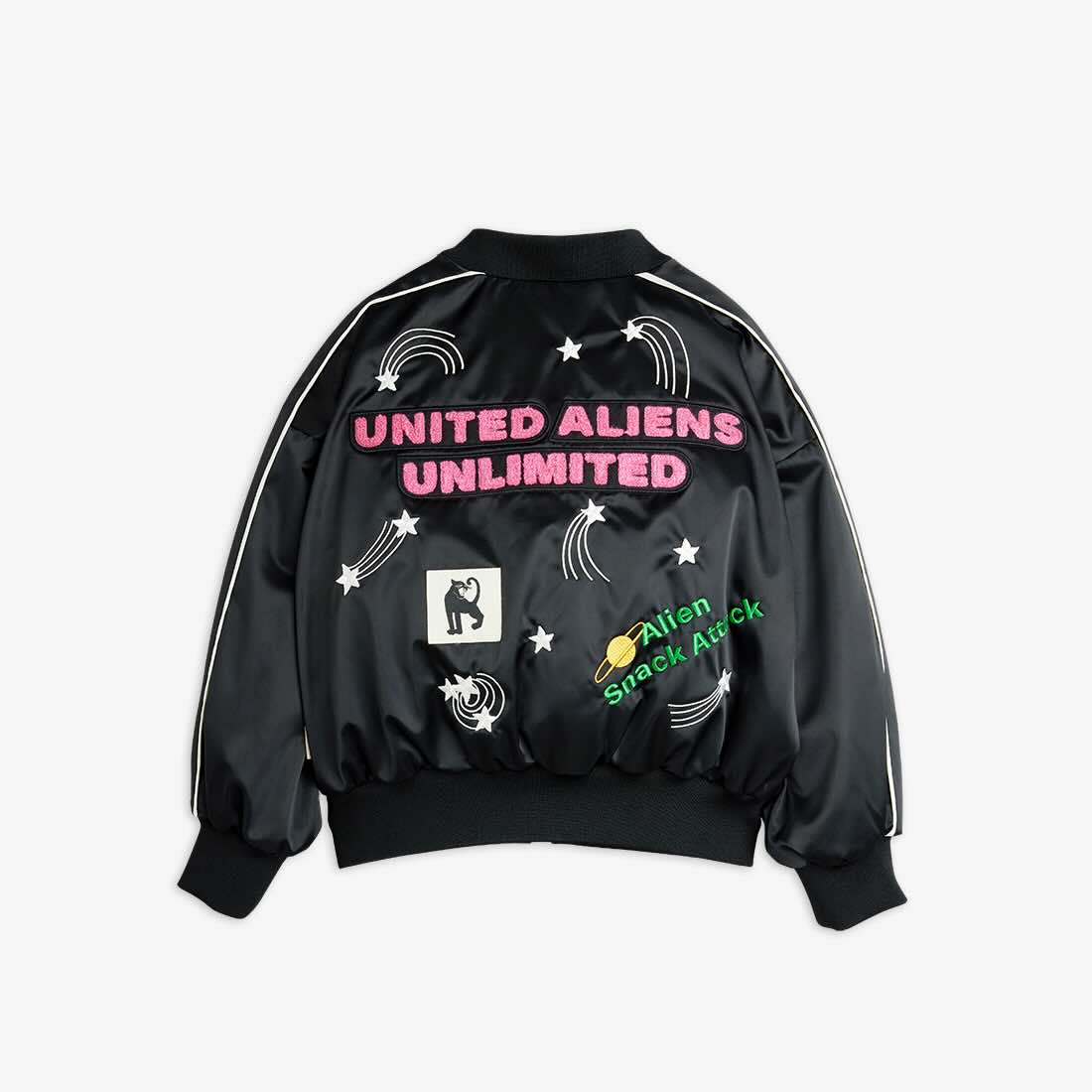 Cool zwart satijnen bomberjasje van Mini Rodini met 'United Aliens Unlimited' op de rug, alien patch en sterrenprint op de rug.