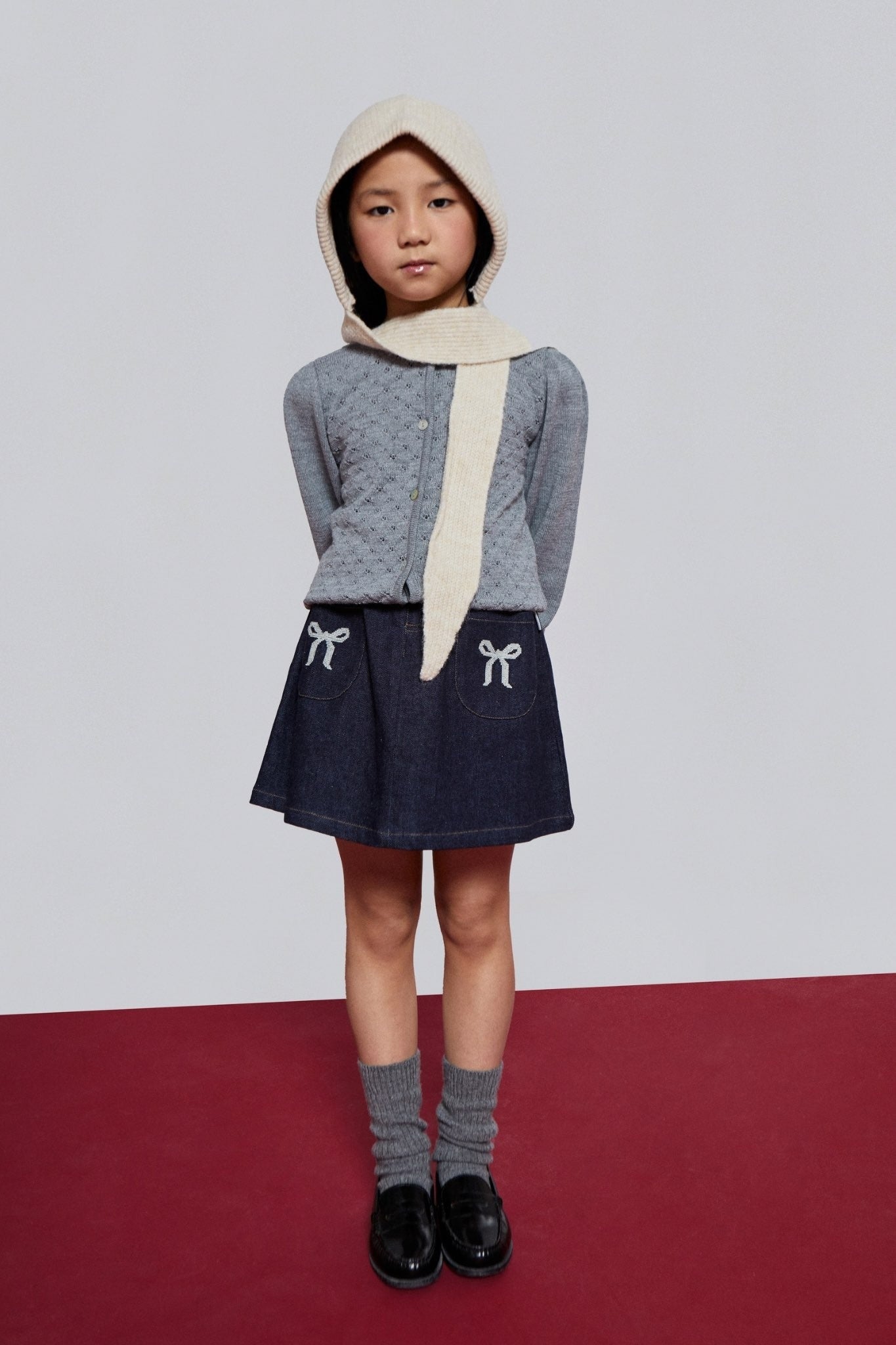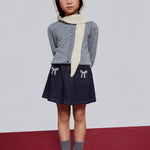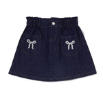 Deze klassieke denim minirok is ontworpen met een elastische tailleband voor extra comfort en voorzien van twee contrasterende lintborduursels voor een speelse maar tijdloze afwerking.