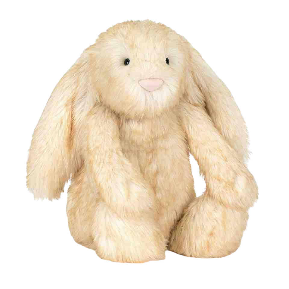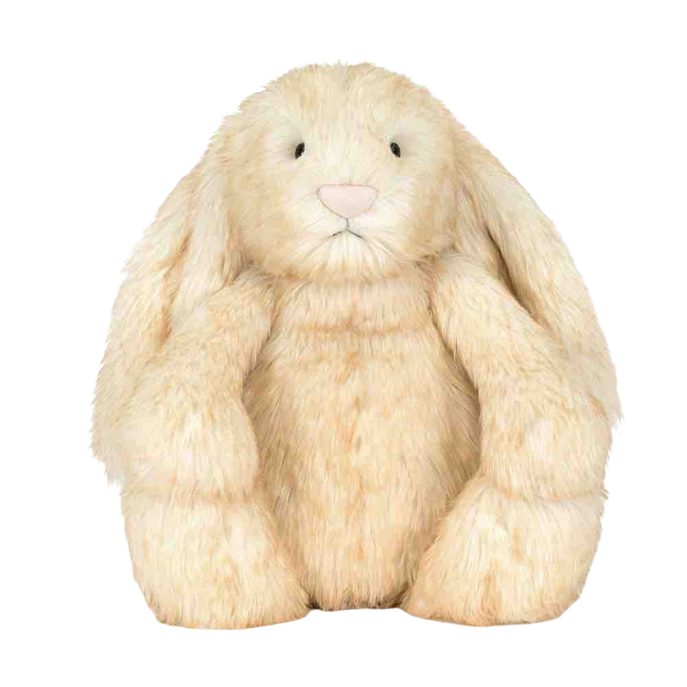 Een groot, superzacht luxe knuffelkonijn met beige/cremekleurige vacht, lange oren en een lief snoetje – ideaal voor knuffelen, decoratie of als cadeau.