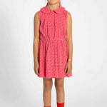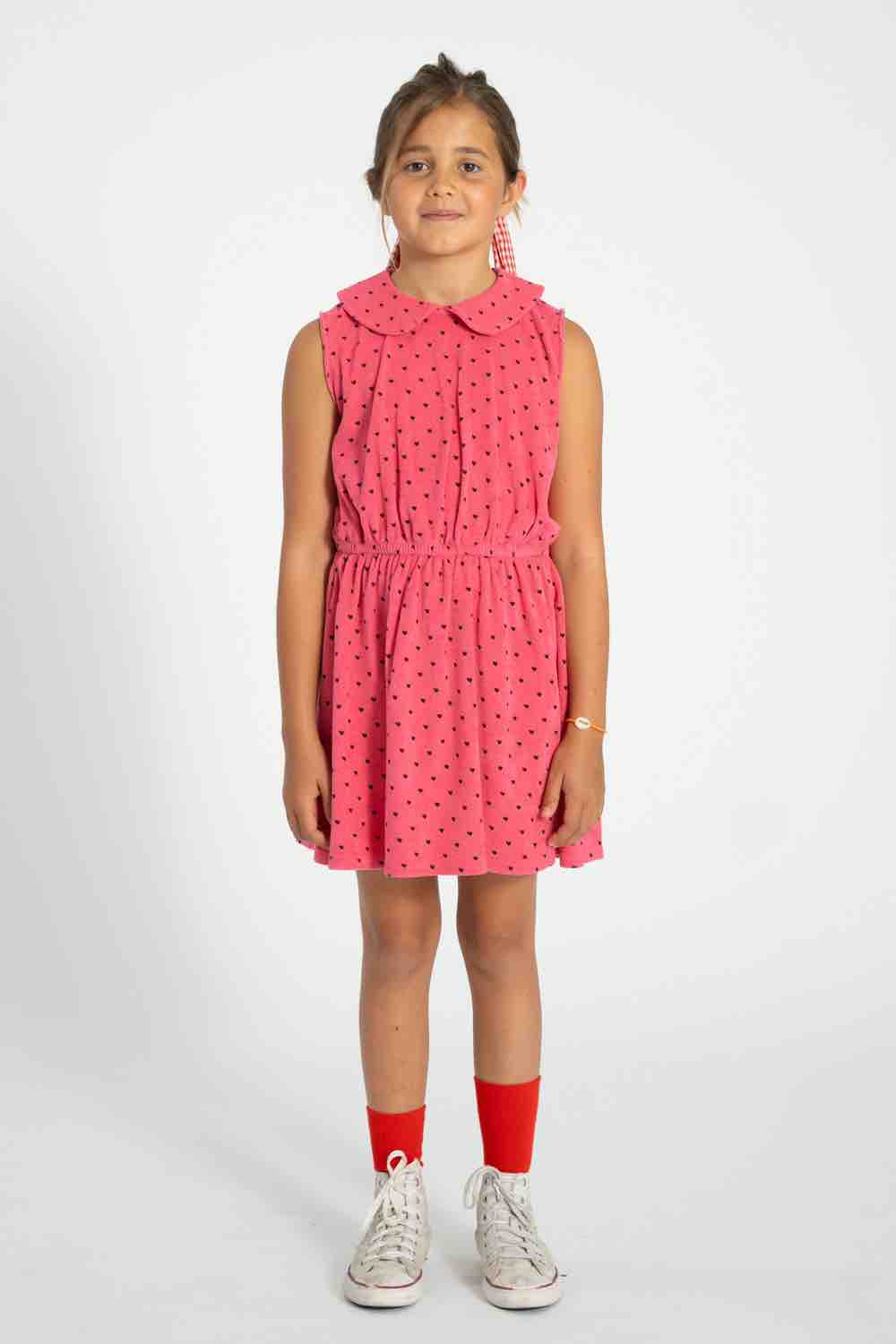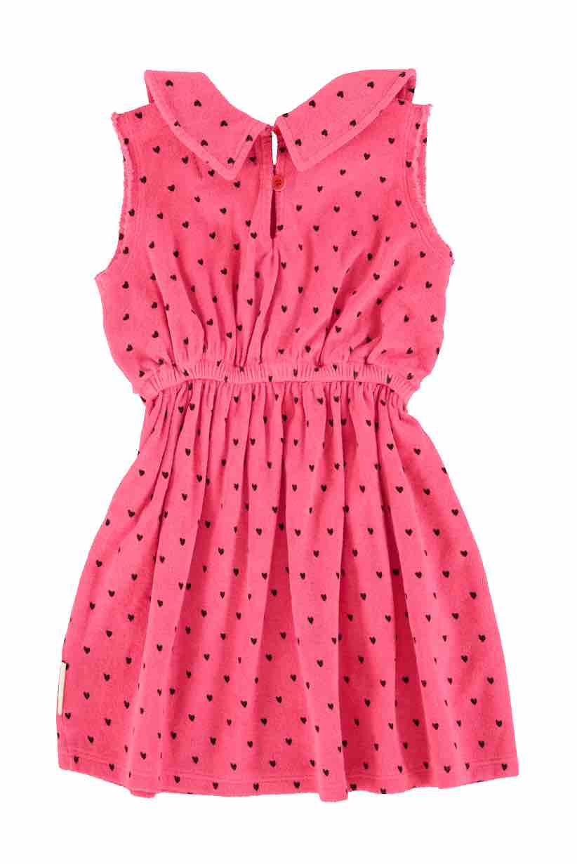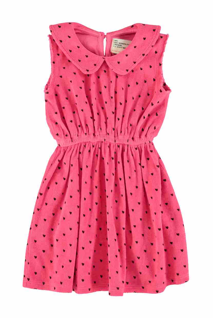 Mouwloos jurkje met lief kraagje en een elastieke band in de taille. Het Piupiuchick jurkje heeft een all over hartjes print.