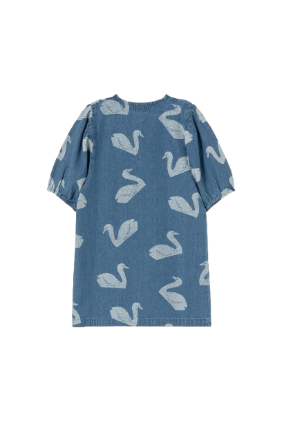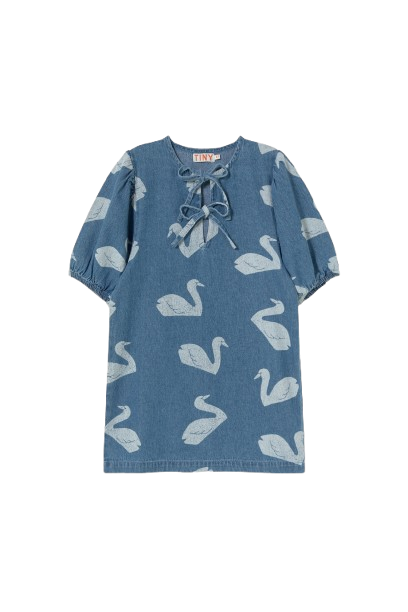Prachtige denim jurk met allover zwanen print van Tiny Cottons.