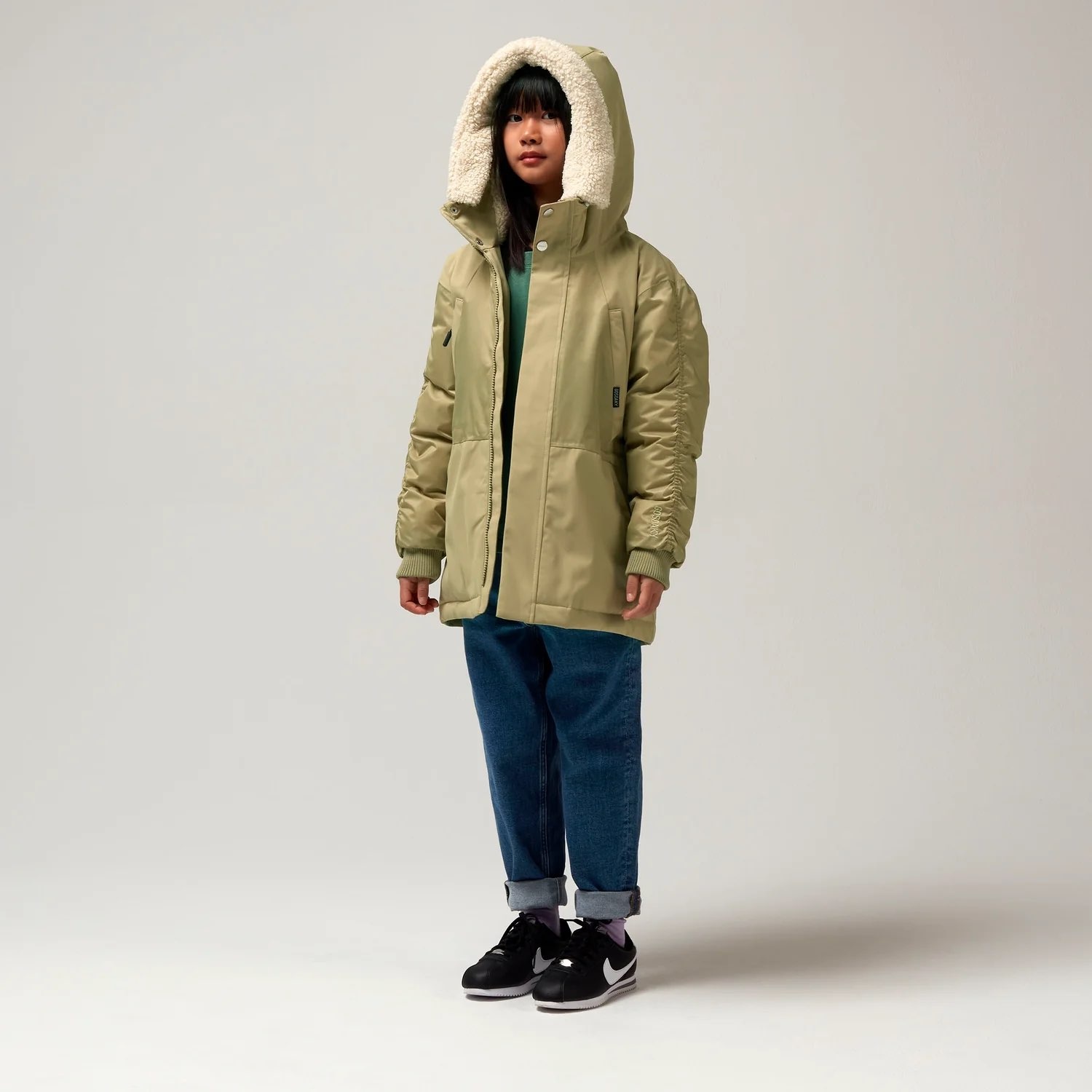 FUNNY FROG jas van GoSoaky in de Gray Green kleur is waterdicht en heeft een capuchon met afneembare rand van imitatiebont voor extra warmte rond het gezicht. De waterdichte satijnen panelen en gesmokte mouwen geven het jasje een geklede en coole look.