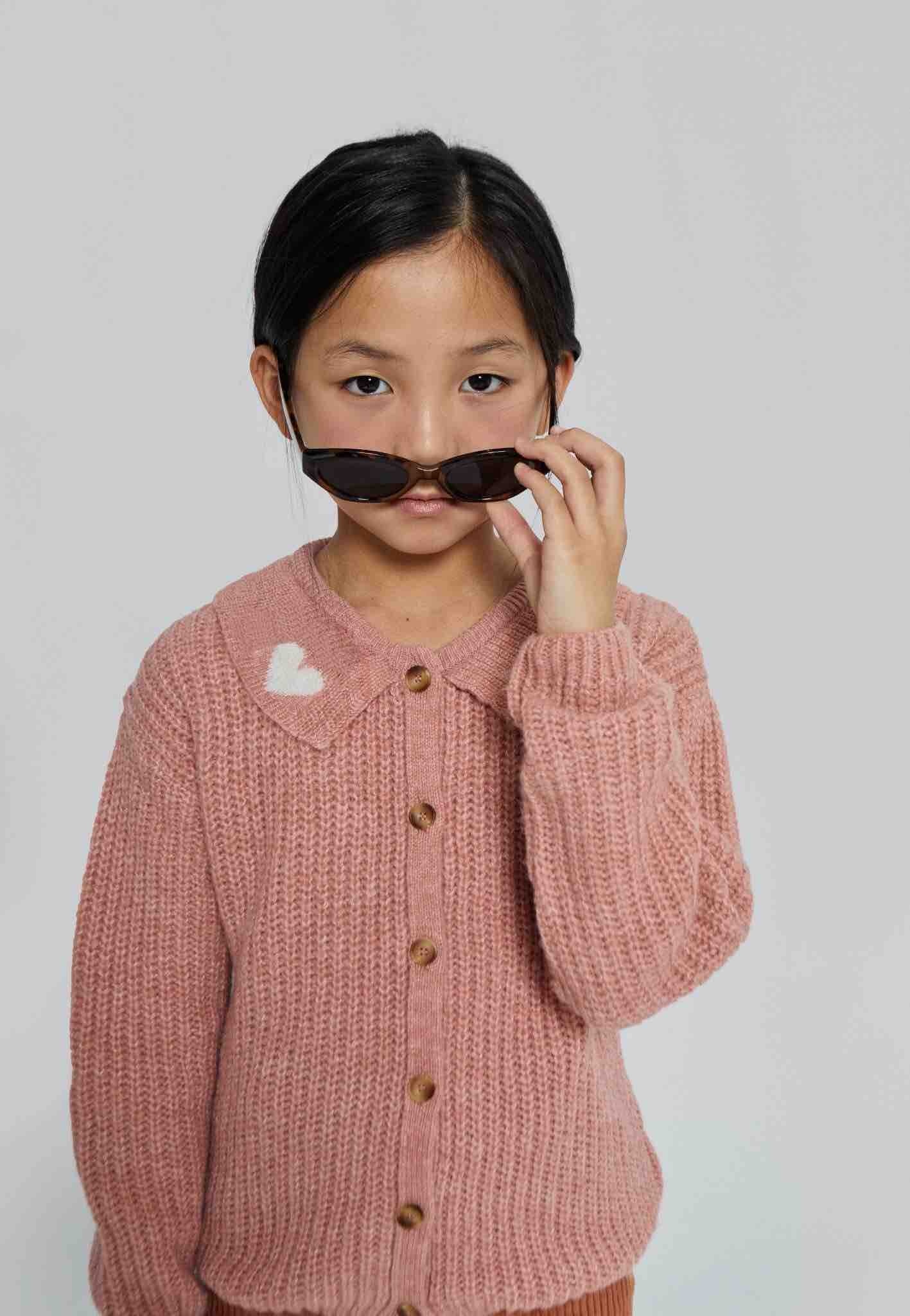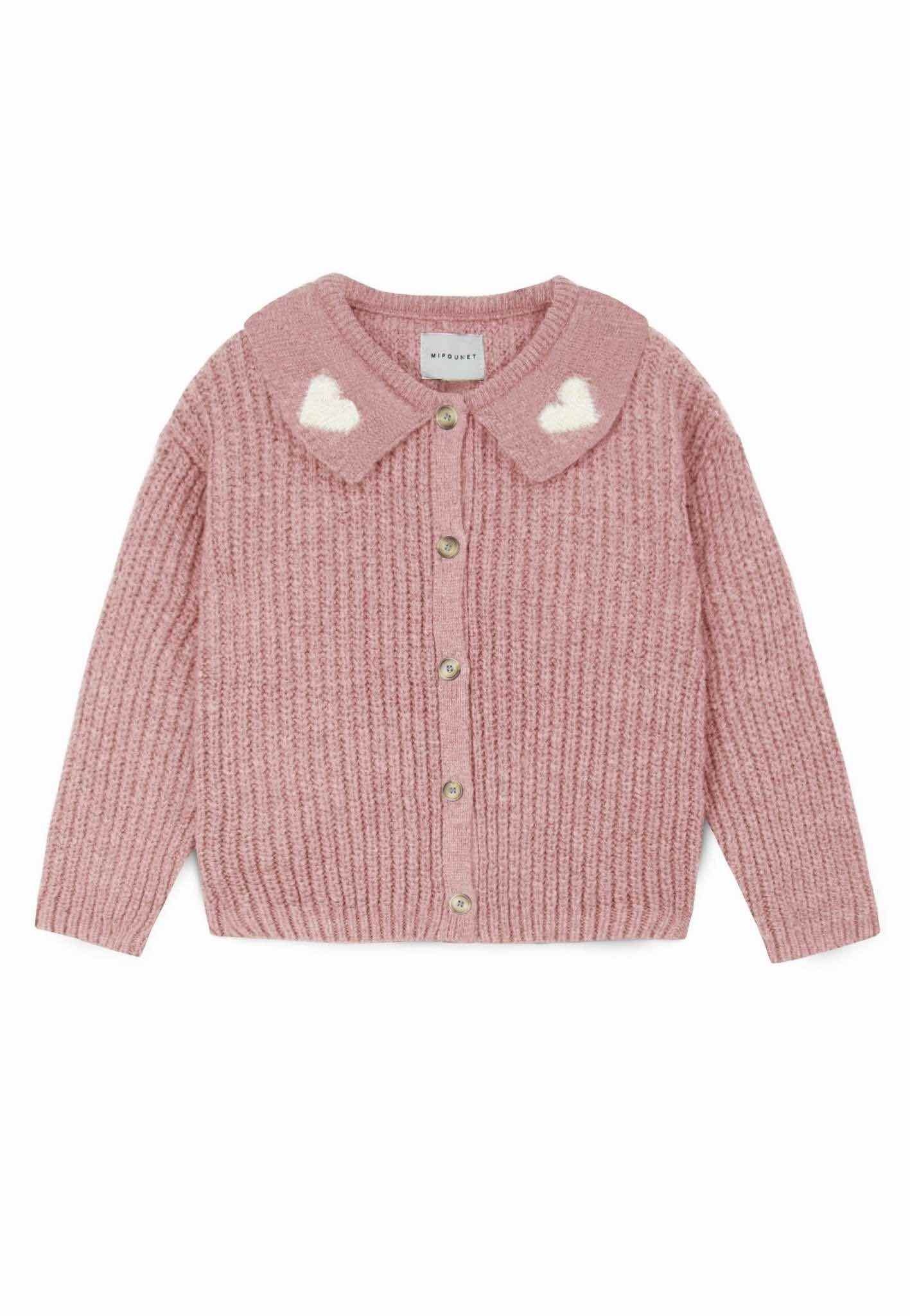 Dit geribbelde vest is uitgevoerd in een warme breivorm en heeft een contrasterende hartjes motief over de kraag.