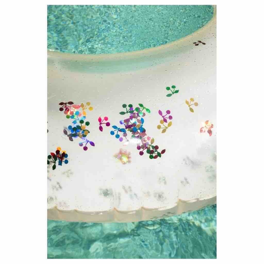 Opblaasbaar, doorzichtige grote aandrijfring gemaakt van duurzaam pvc met binnenin glitterconfetti.