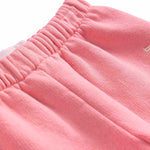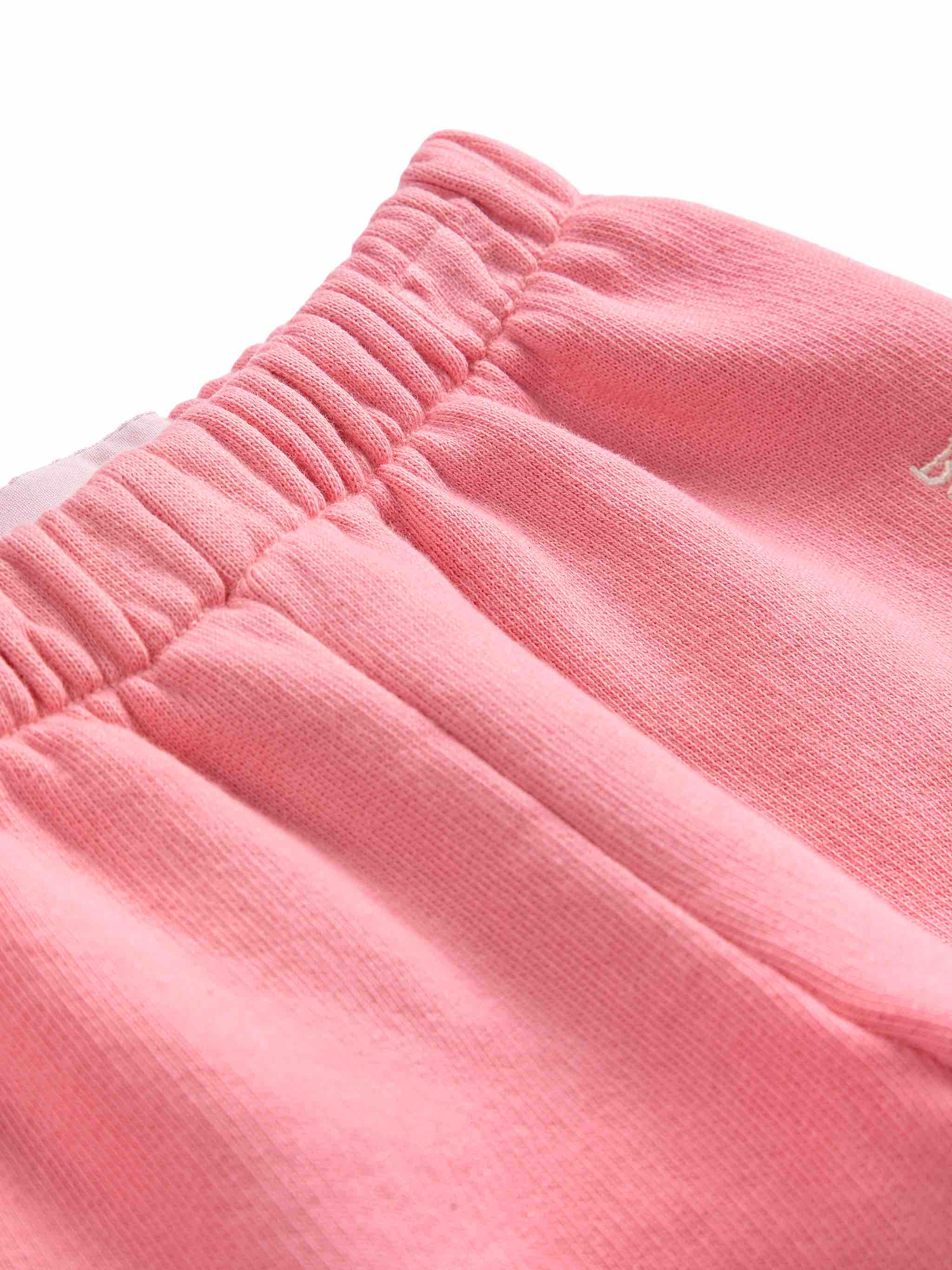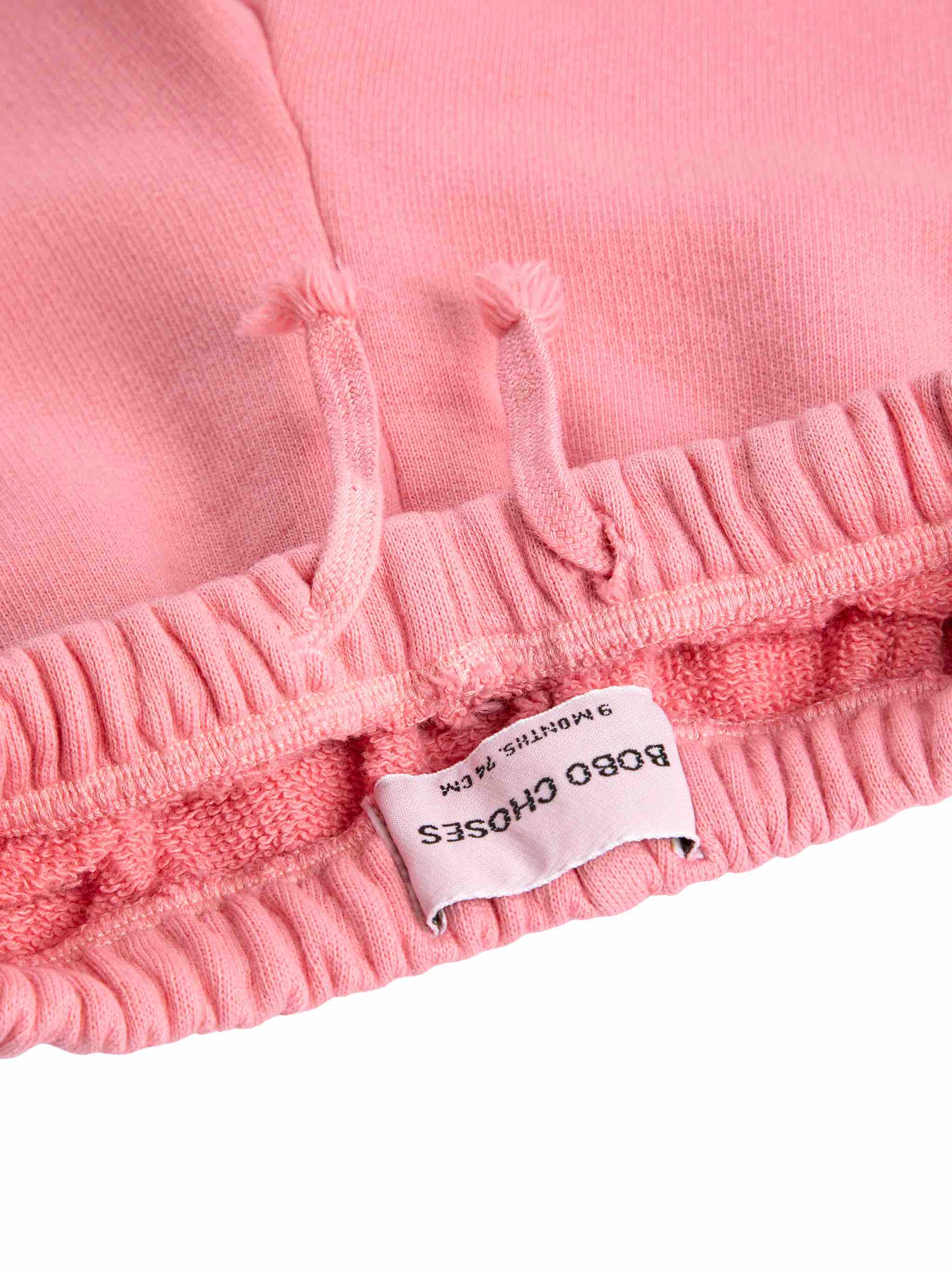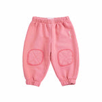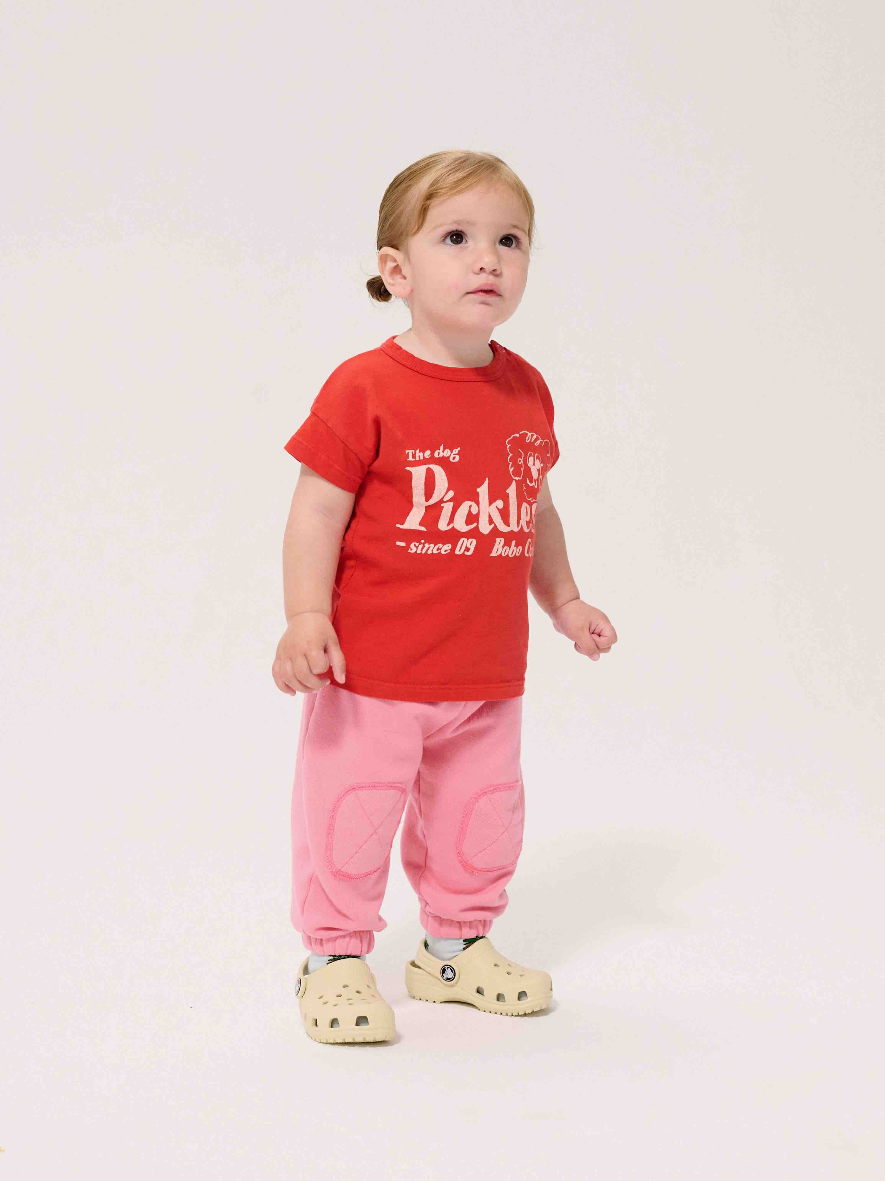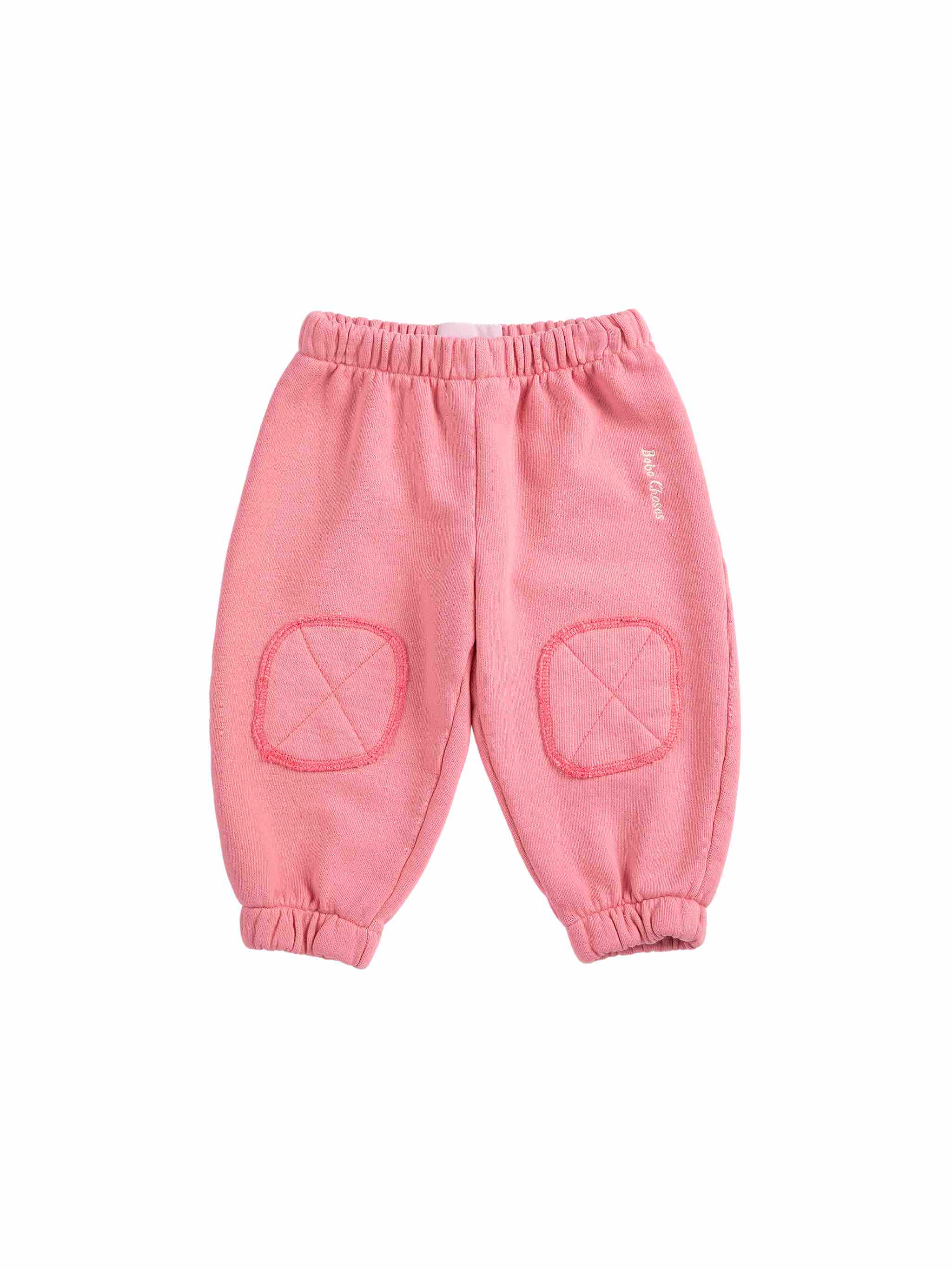 Comfortabele joggingbroek in roze met kniepads. Leuk te combineren met "The Dog in the Pickle" t-shirt in rood van Bobo Choses.