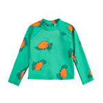 Bobo kiest voor een T-shirt met een oranje print dat helemaal bedekt is met zwemkleding.
