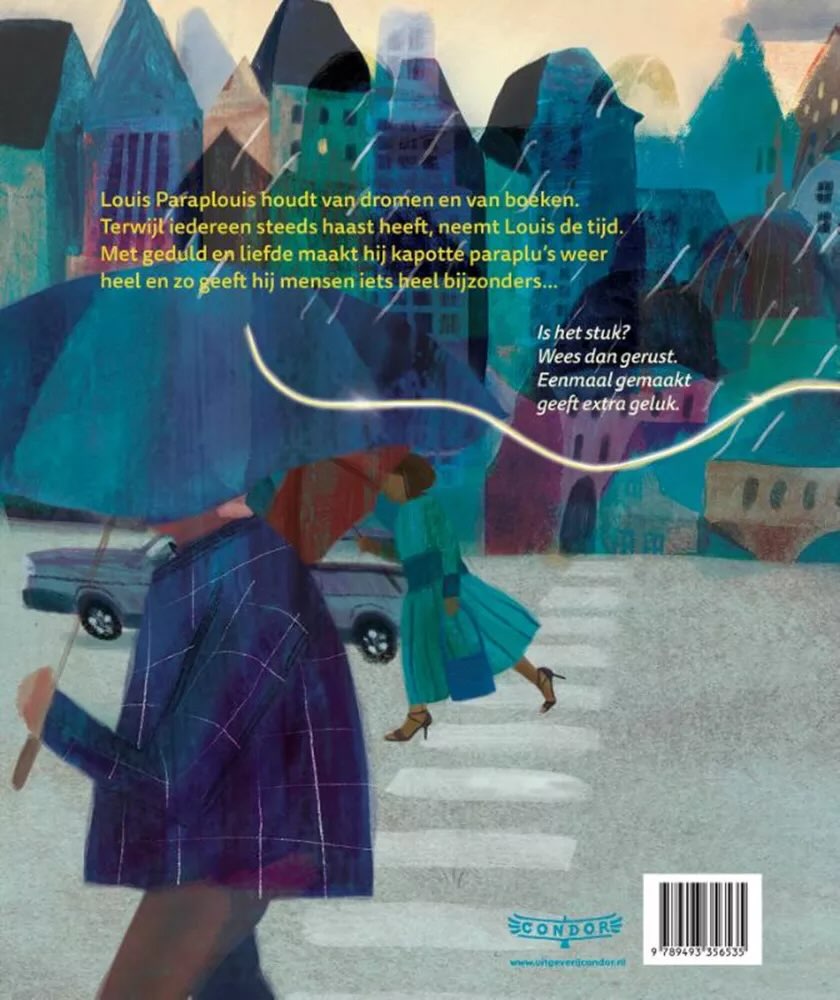 Kapotte paraplu? Geen zorgen! Louis Paraplouis komt te hulp met zijn magische gouddraad en tovert verleidelijke dagen om in kleine geluksmomenten. Louis staat op de hoek van een drukke straat met zijn karretje vol gereedschap. Hij helpt een verregende sjieke dame, een chagrijnige jongeman en een meisje met een lieveheers kikkerplu. Hij biedt niet alleen bescherming, maar ook een essentiële kleur en roest in de grijze stad.