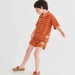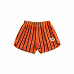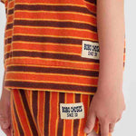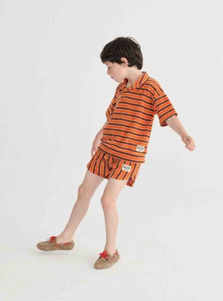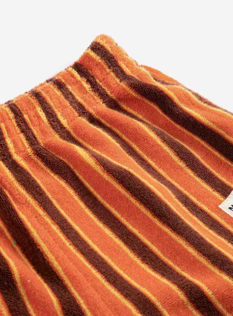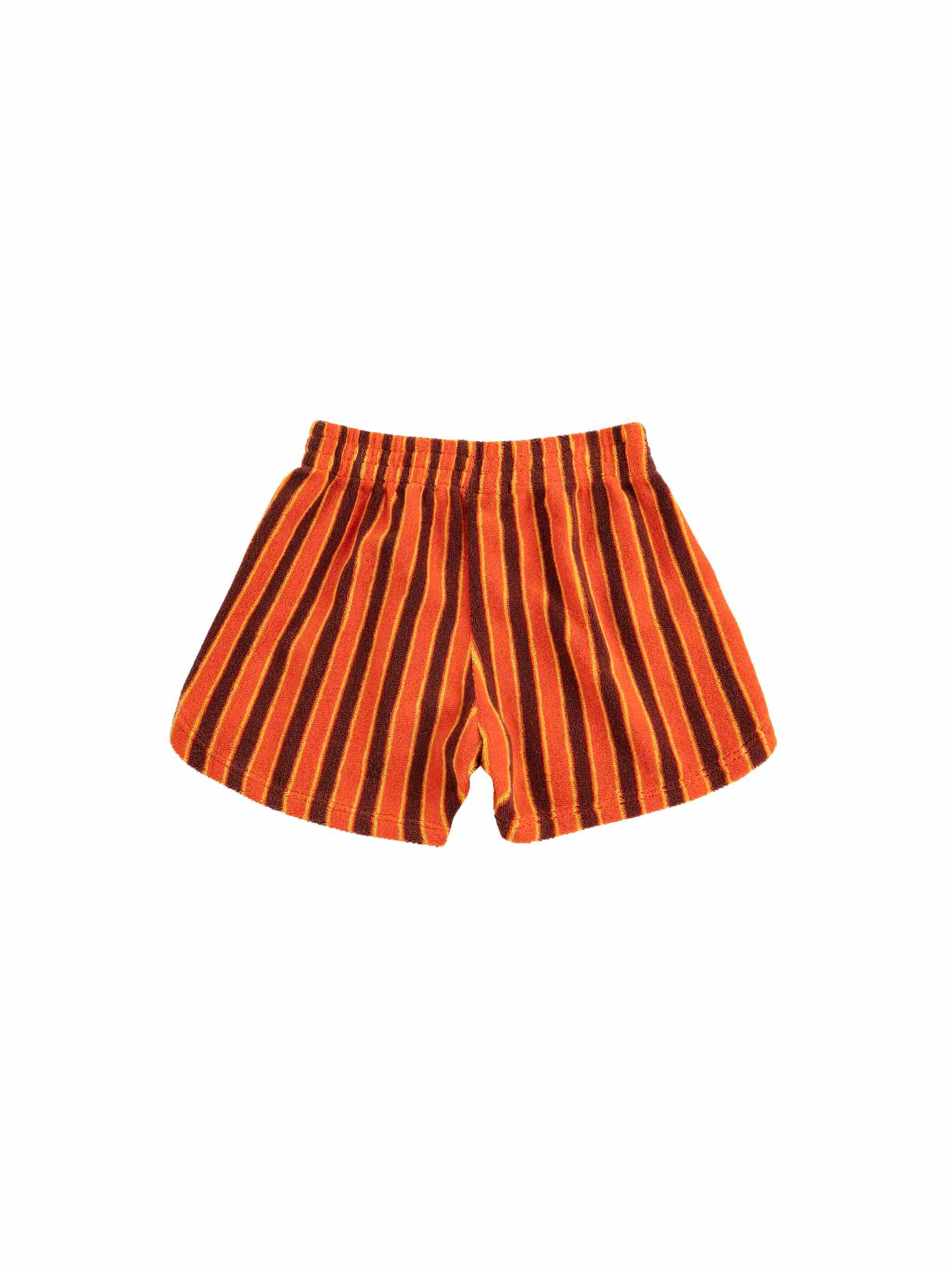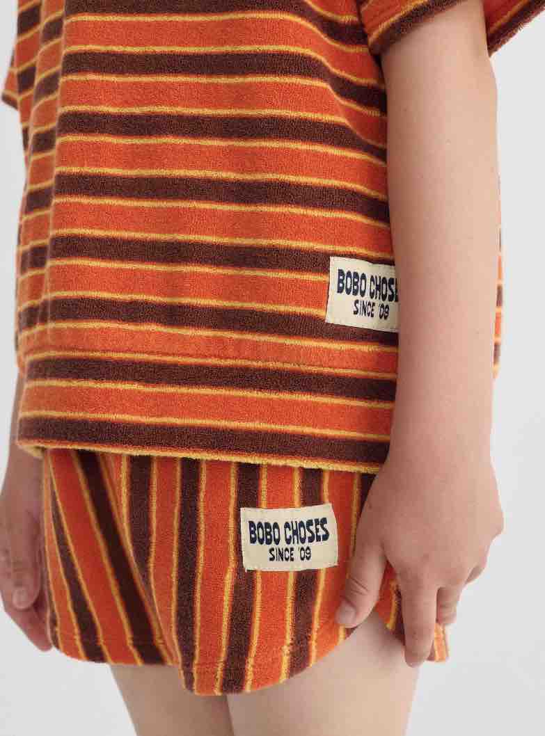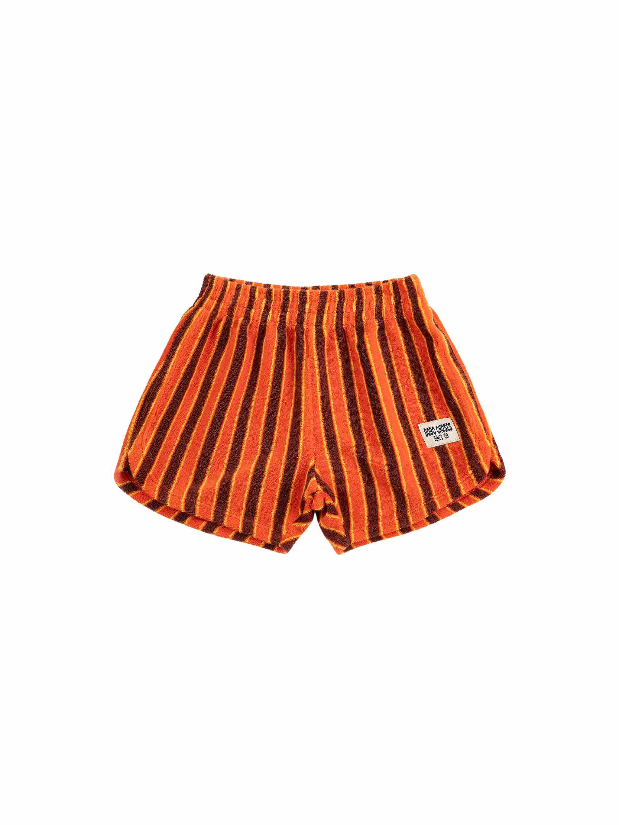 Bobo kiest voor gestreepte, baksteenkleurige badstof shorts.