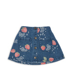 Denim rok van Konges Sløjd van biologisch katoen met zakken aan de voorkant en volledige knoopsluiting. Met een elastische tailleband aan de achterkant voor een comfortabele pasvorm. Allover 'marmelade sun' aardbeiprint.