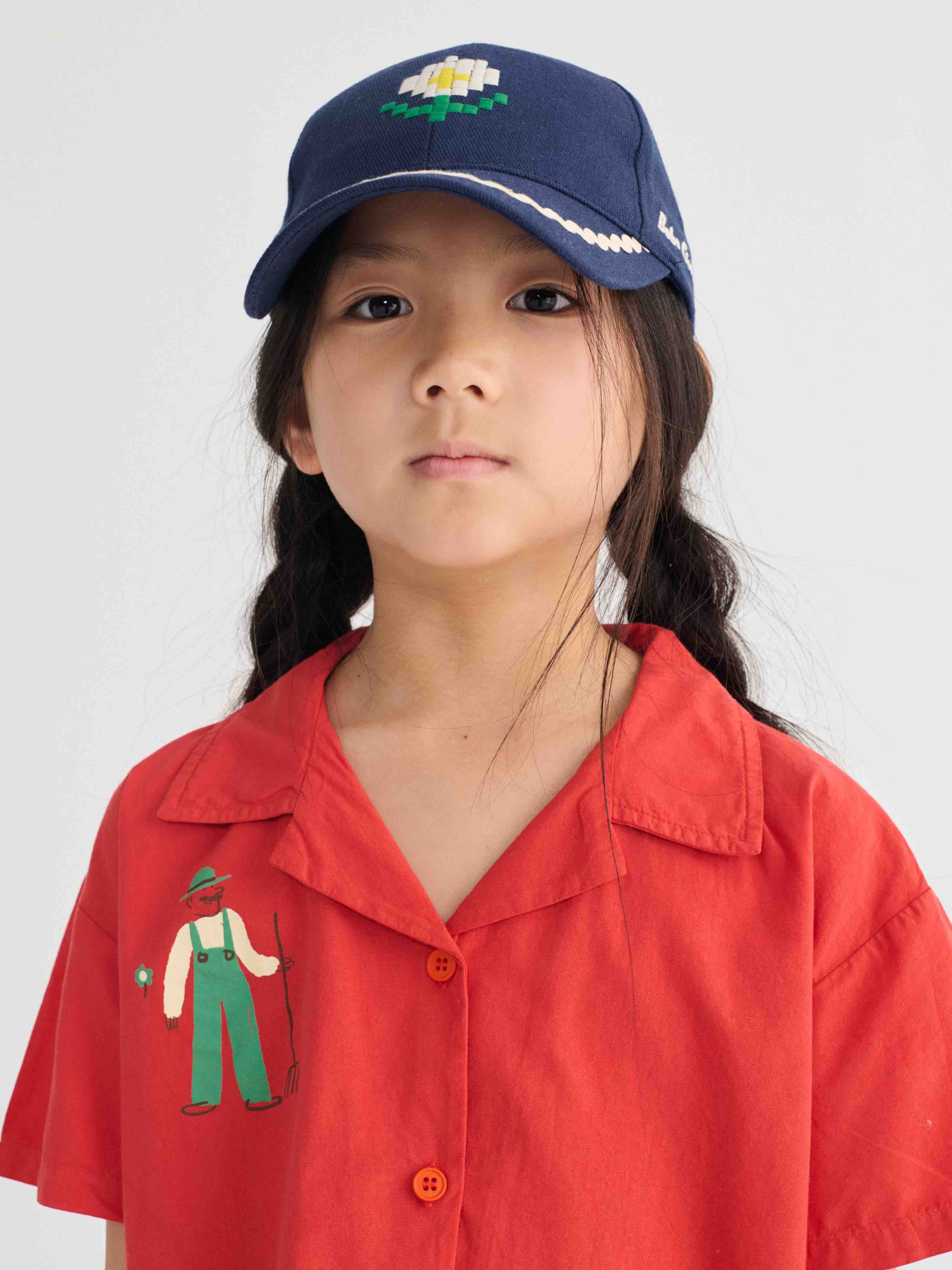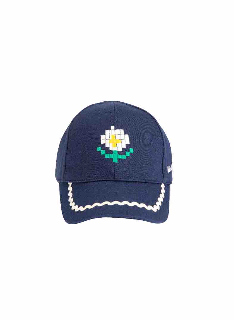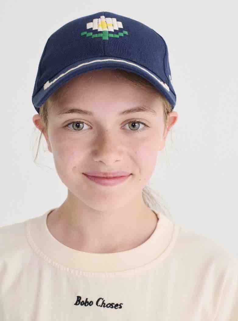 Bobo kiest voor een pet van keperstof met pixel- en madeliefjesmotief.