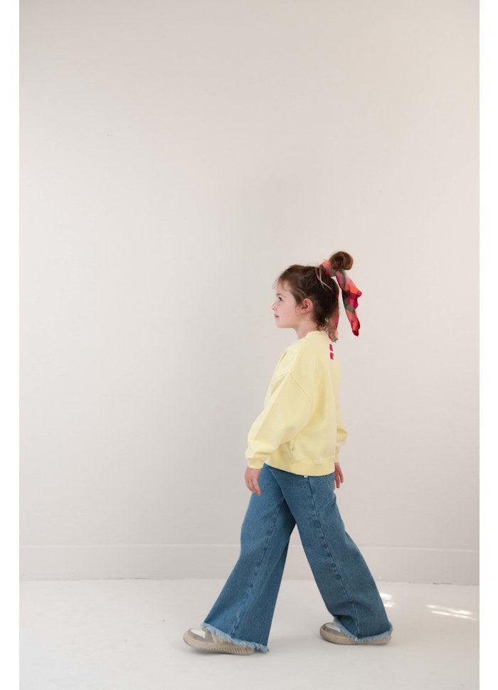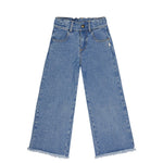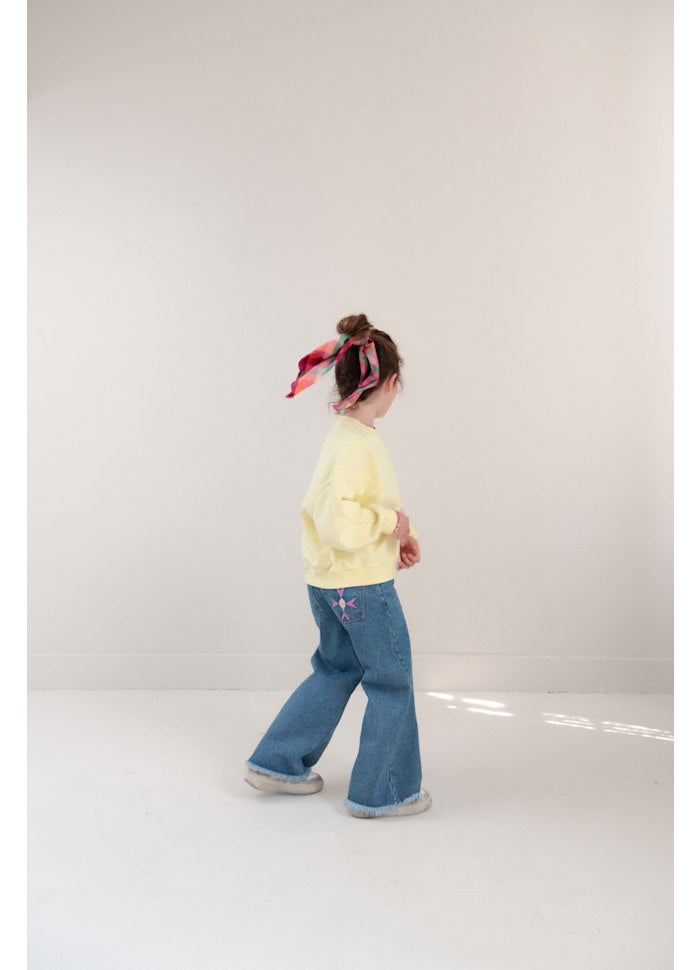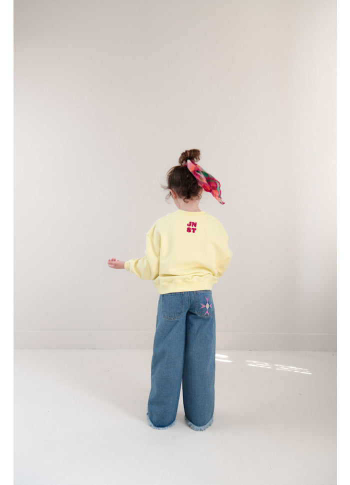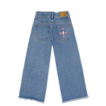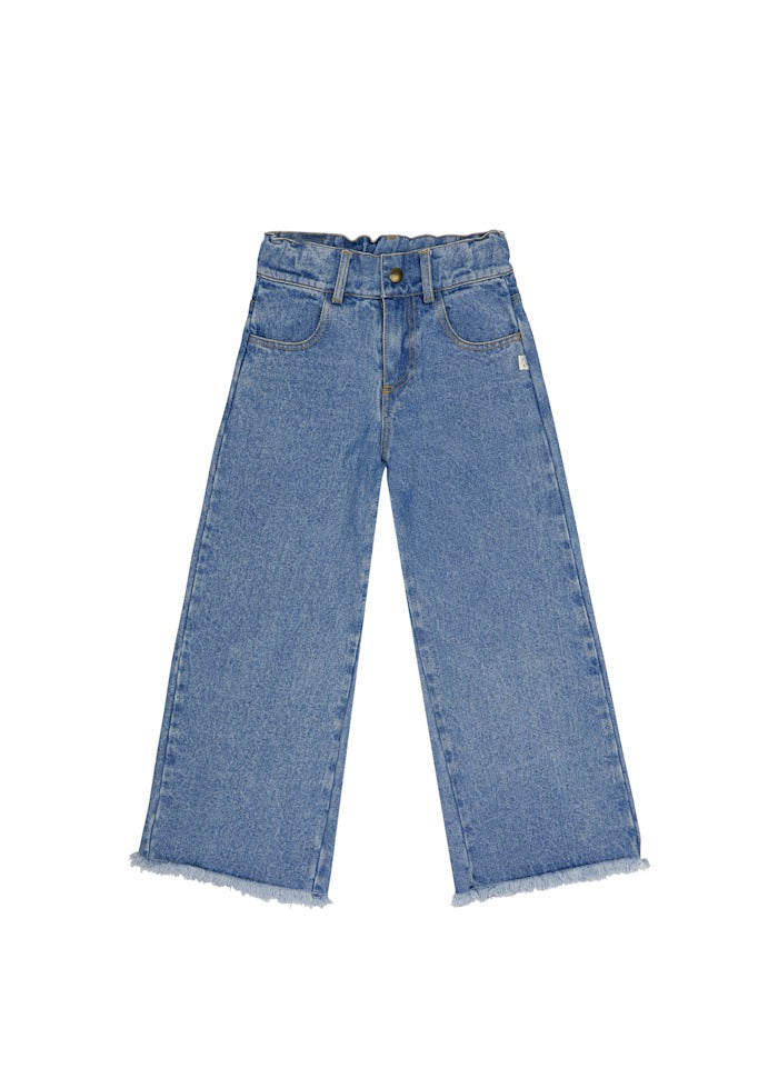 Sera spijkerbroek van Jenest met wijde pijpen heeft een verstelbare elastische tailleband, steekzakken, opgestikte achterzakken en een onafgewerkte zoom voor een unieke look. De rechter achterzak is voorzien van een borduursel.