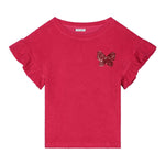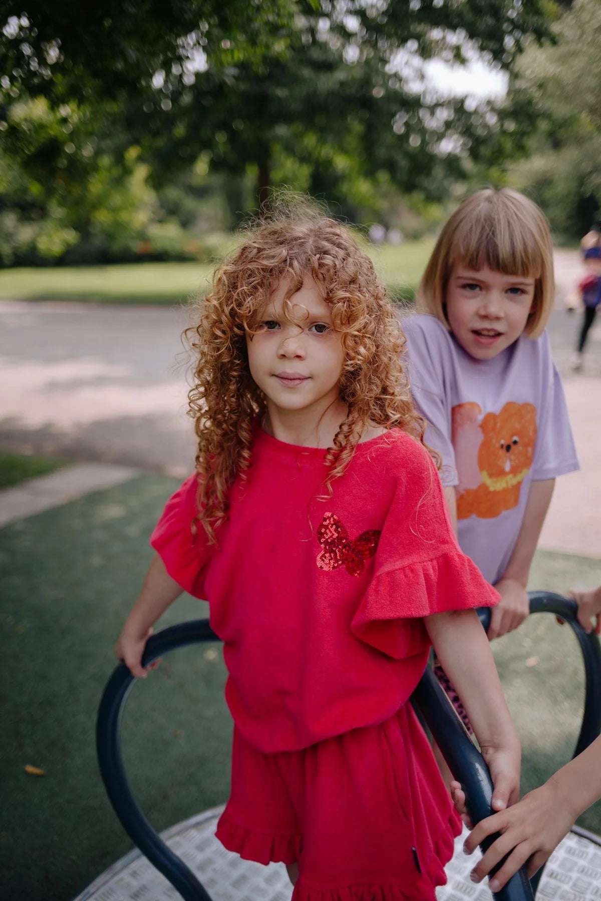 Dit Sally T-shirt in zacht badstof, in de kleur Love Potion met een lief vlinder glitter detail, past uitstekend bij de Sally Shorts in dezelfde kleur.