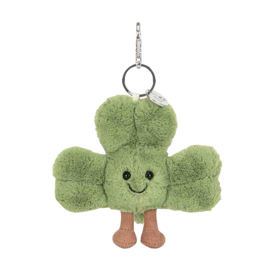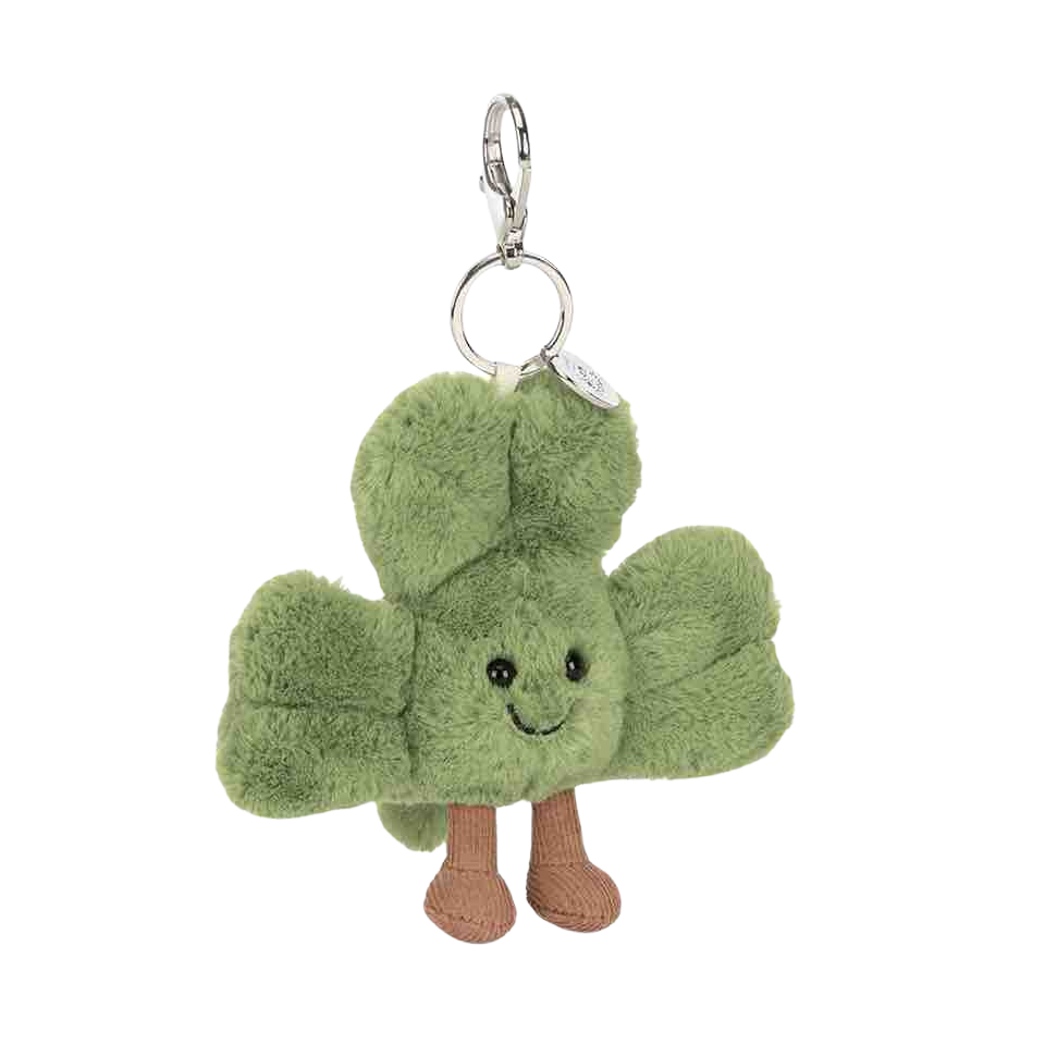 Zachte Jellycat Amuseables Siofra Shamrock Bag Charm een charmant klavertje-vier sleutelhanger/bugel-hanger van pluche, perfect als leuke accessoire voor tas of sleutelbos.