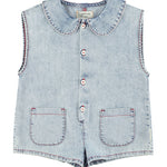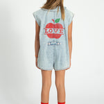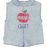 Piupiuchick korte mouwloze jumpsuit | Lichtblauwe denim met appelprint
