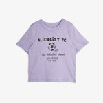 Groene trui van Mini Rodini met 'Inter Galaxy Travel Agency' opdruk, gemaakt van biologisch katoen.
