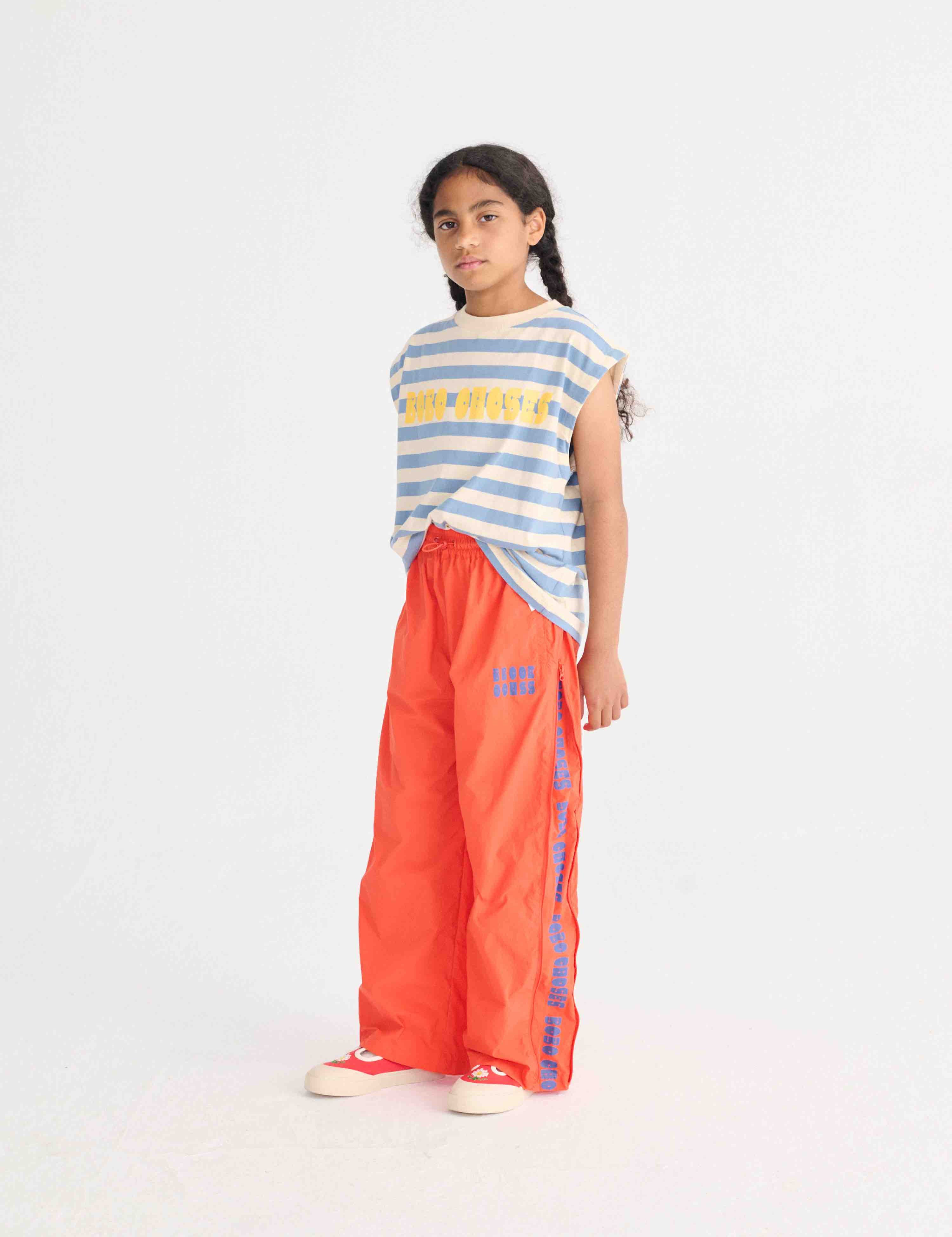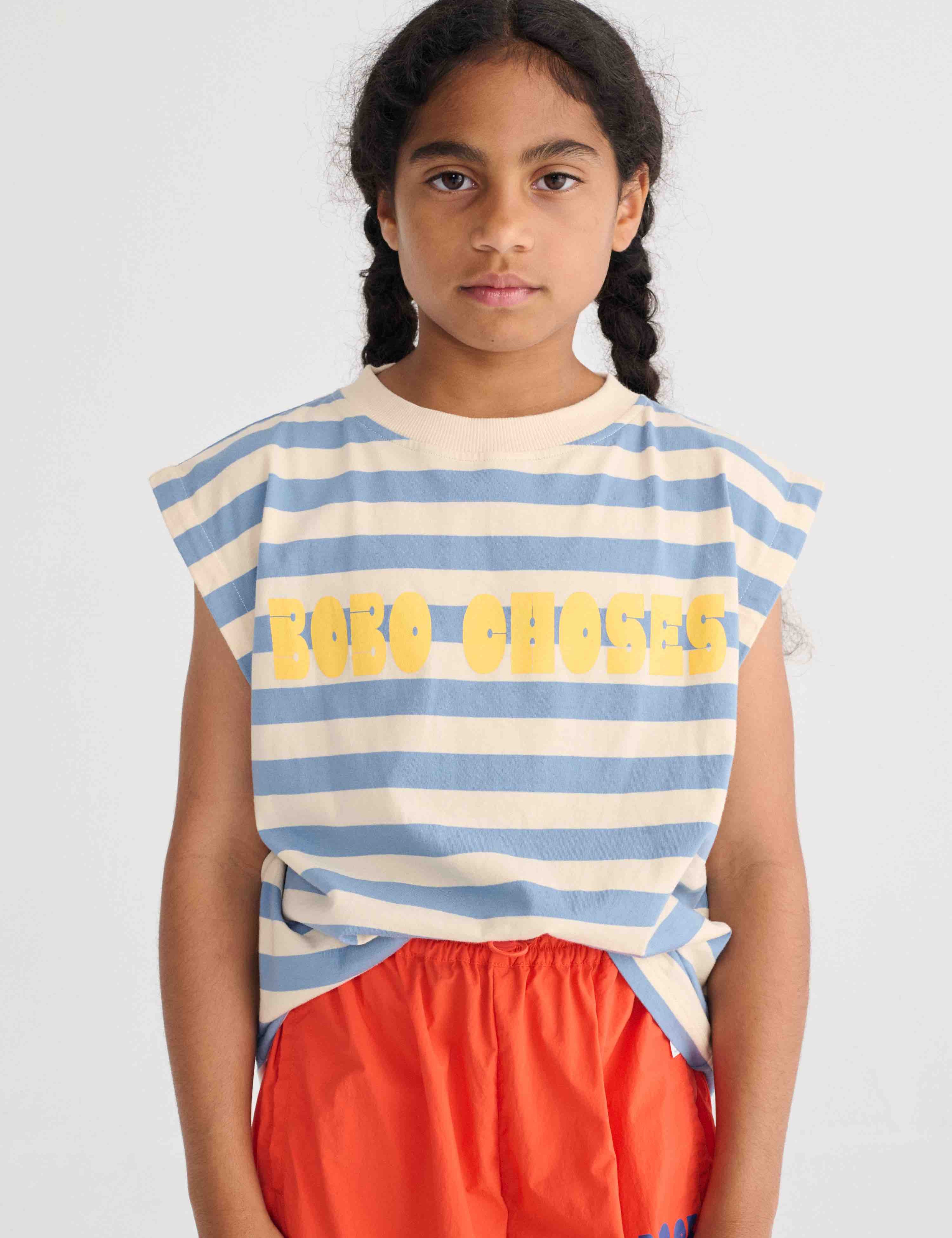 Bobo kiest voor een modern gestreept mouwloos T-shirt.