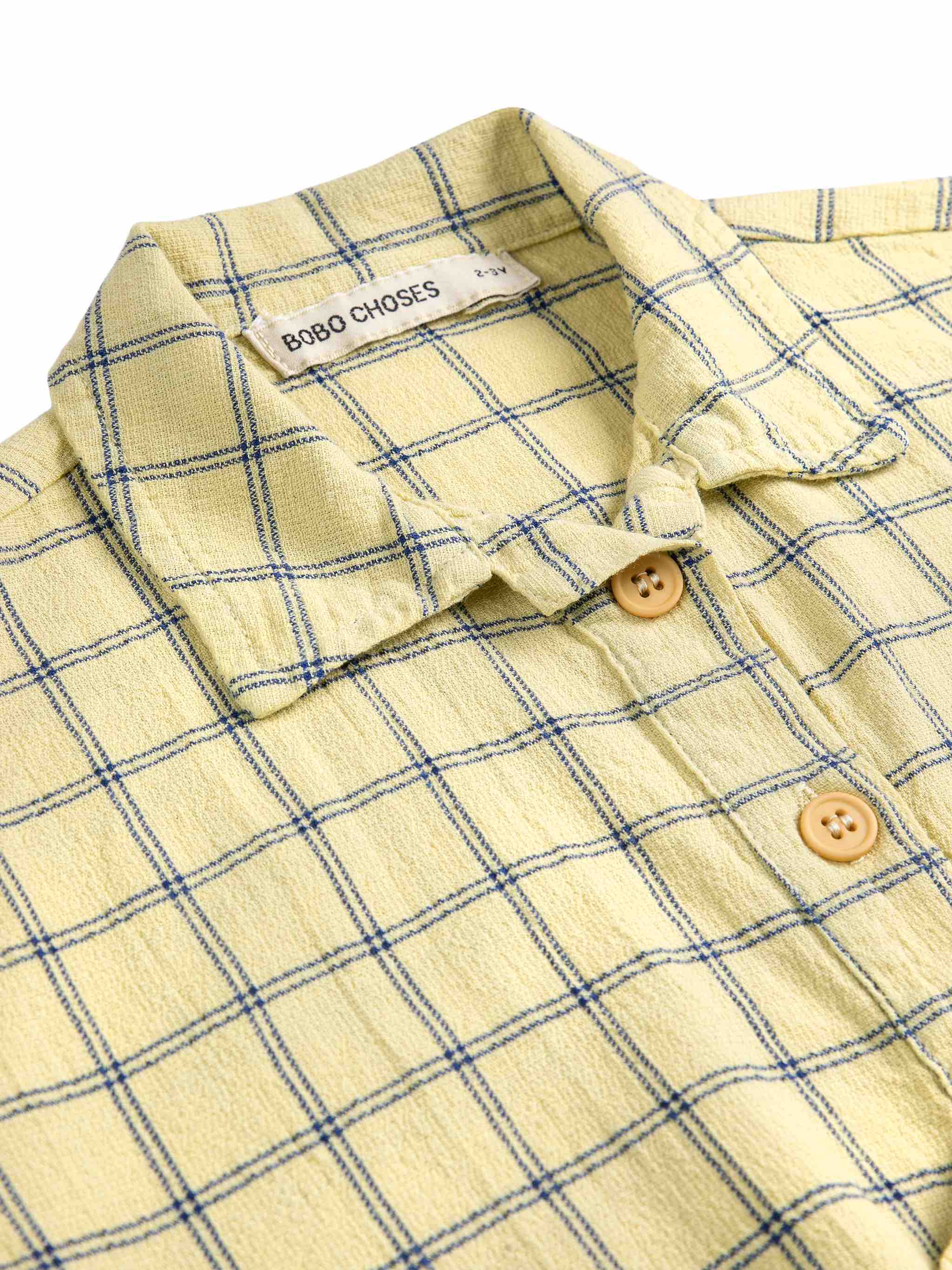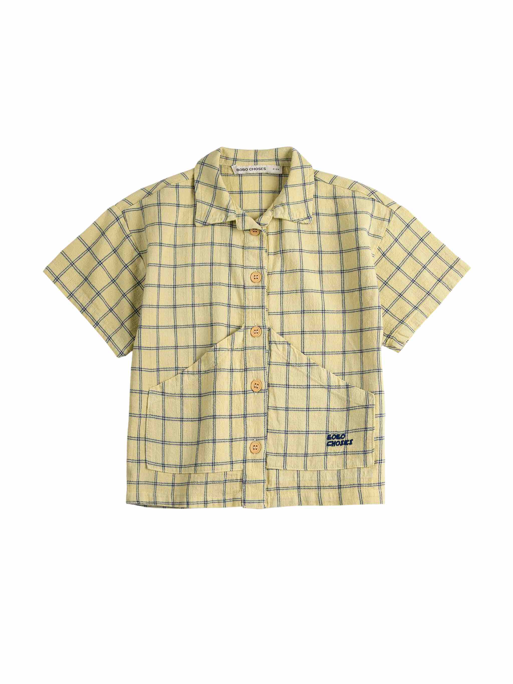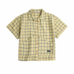 Gele katoenen blouse met donkerblauwe ruiten, zakken op de voorkant en korte mouwen en knoopjes op de voorkant van Bobo Choses.