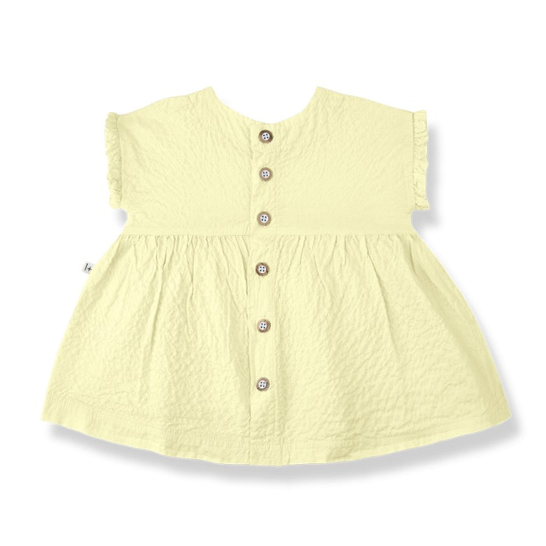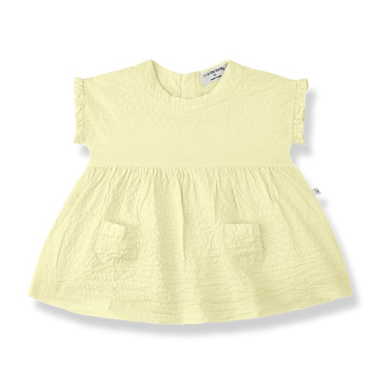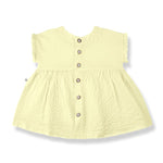 Zomers citroengeel jurkje Troya met ruches en zakjes van One More in the Family.